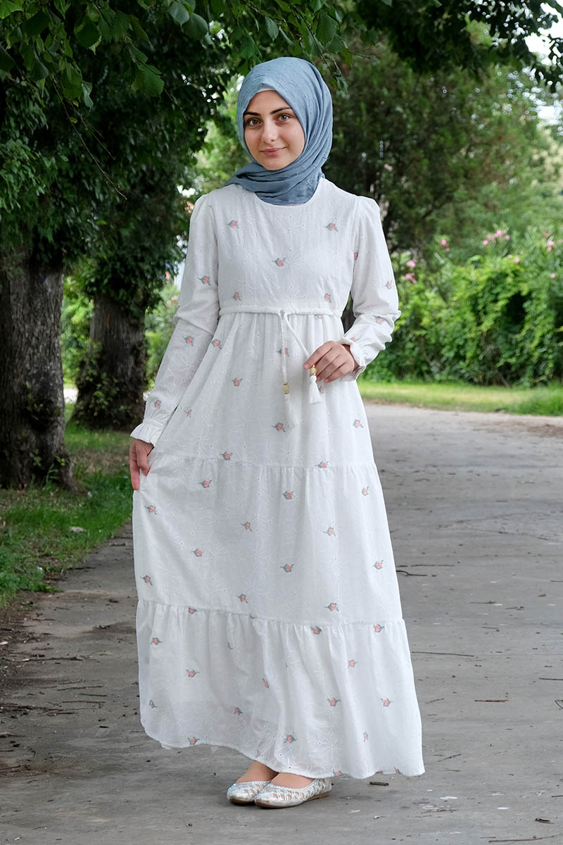 Ürün Özellikleri :Karsu model fisto pamuklu kumaş ile üretilmiştir. Fisto ve çiçek nakış desenli kumaşa sahiptir. İç kısmı komple pamuk astarlıdır. Bel kısmı ayarlanabilir iplidir. Etek modeli kat katdır. Arkası gizli fermuarlıdır. Kolları lastiklidir.